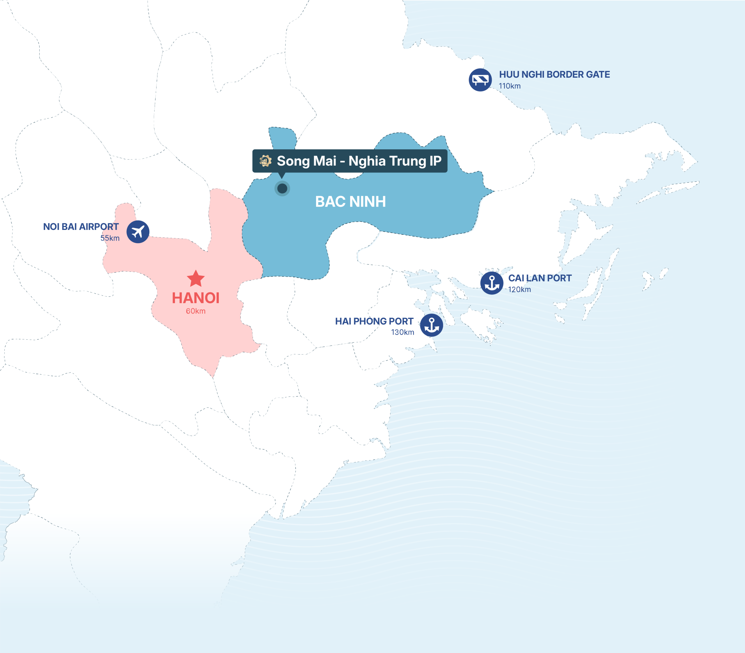Song Mai – Nghia Trung Industrial Park is located in Bac Ninh Province, situated on the industrial belt with superior transportation infrastructure connecting to economic centers such as Hanoi, Hai Phong, and Lang Son.