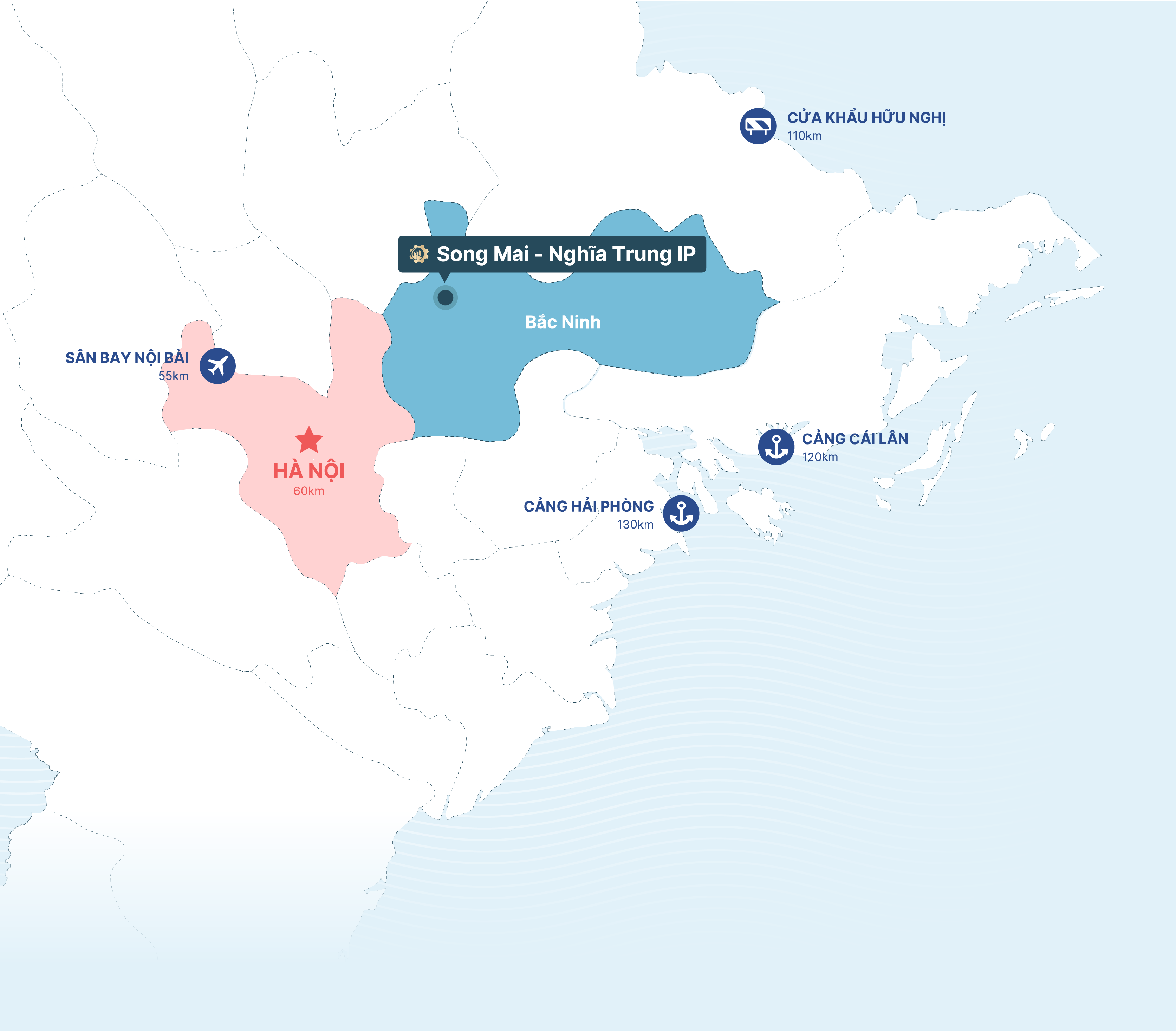 Khu Công Nghiệp Song Mai – Nghĩa Trung thuộc địa phận tỉnh Bắc Ninh, nằm trên trục vành đai công nghiệp có hạ tầng giao thông vượt trội kết nối với các trung tâm kinh tế như Hà Nội, Hải Phòng, Lạng Sơn.